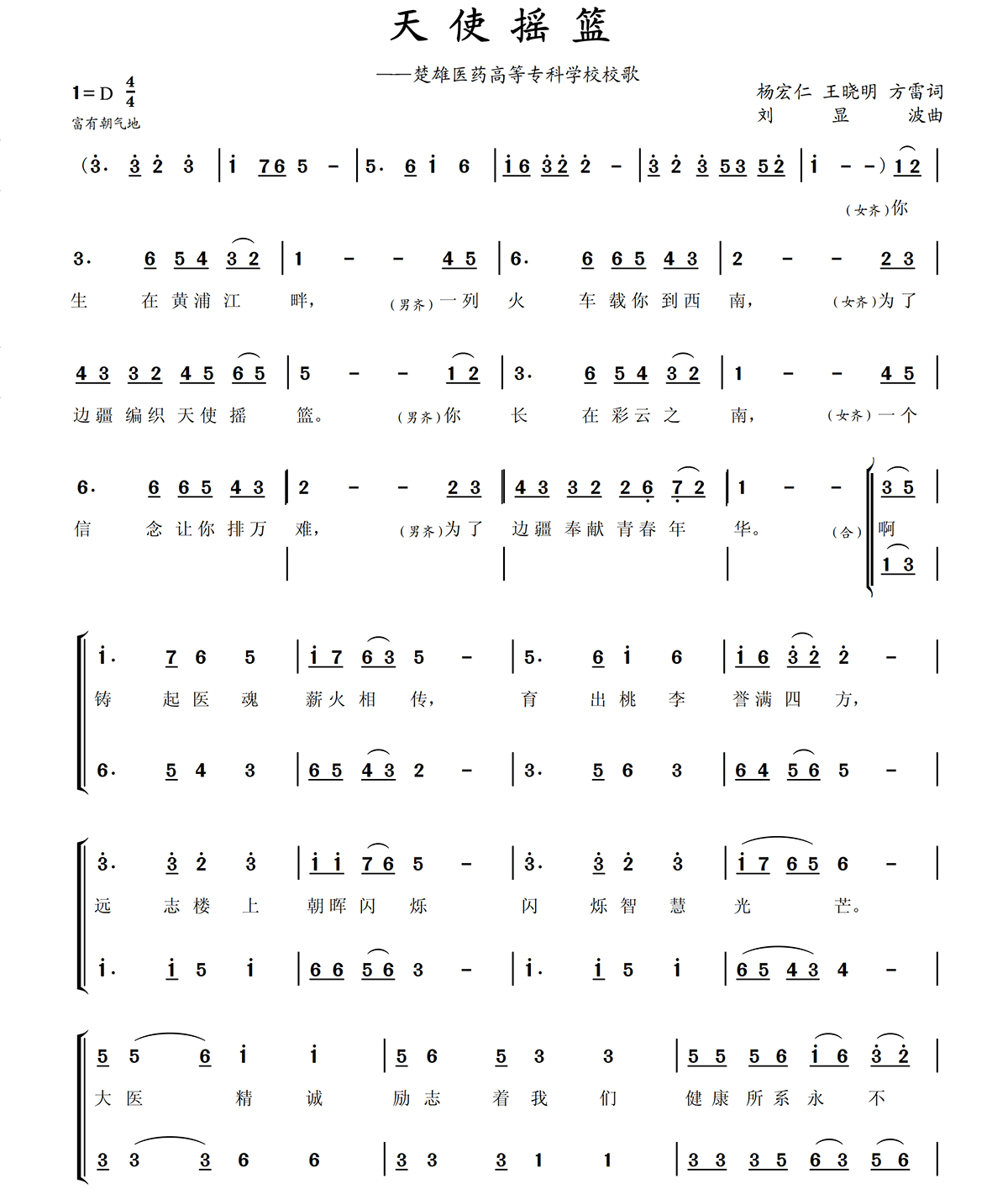 第八十四条 校歌:《天使摇篮》。作词:杨宏仁、王晓明、方雷。作曲:刘显波。