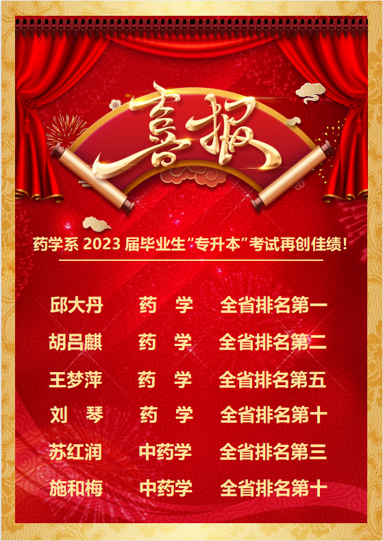 在此,药学系全体师生向各位在专升本考试中取得较好成绩的同学表示热烈祝贺!希望他们铭记“砺志笃行,大医精诚”的校训,继续努力,不负韶华,为实现个人梦想和为学校争光而接续奋斗。同时,也希望其他同学以学长学姐们为榜样,奋力拼搏、追求卓越,在求学就业等方面早日实现自己的理想。